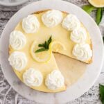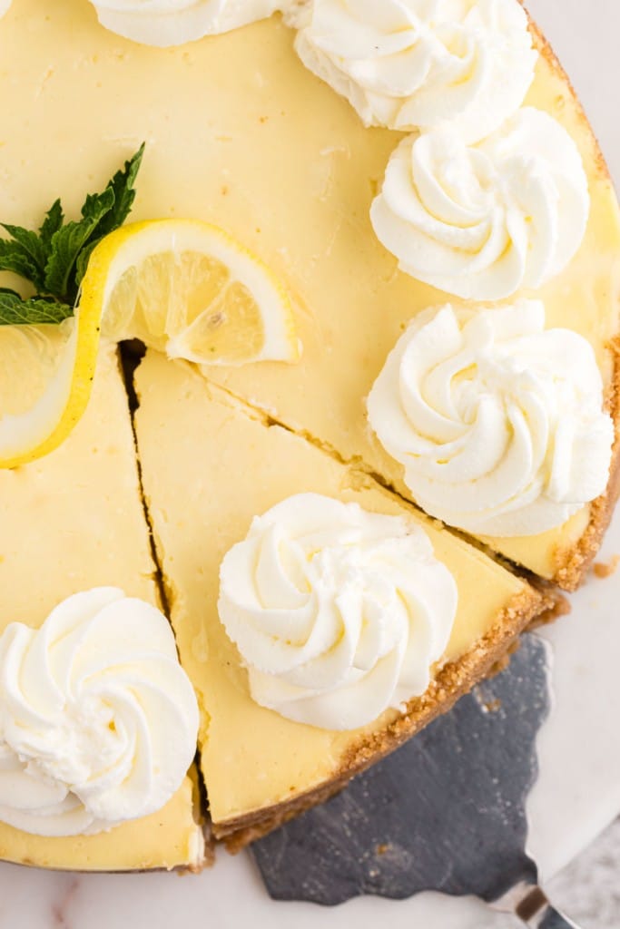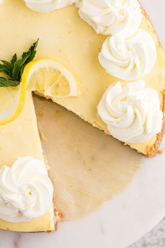 Creamy lemon cheesecake can be garnished with fresh blueberries, whipped cream, and/or some edible flowers – add these once the chilled cheesecake has been removed from the fridge! You can also keep it simple and just add a few fresh lemon slices.