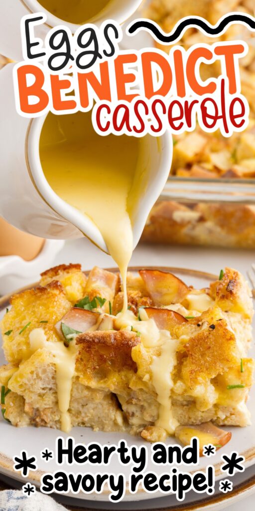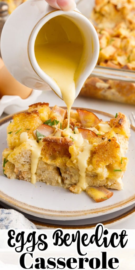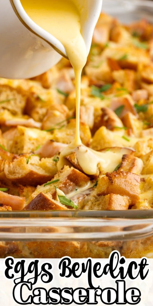 - Drizzle the hollandaise sauce over the warm eggs benedict casserole and then garnish with fresh chives and/or parsley. Serve with extra hollandaise sauce.