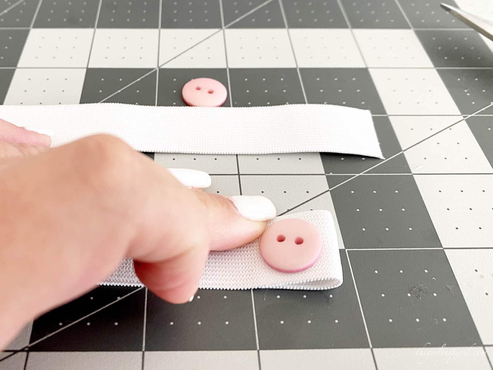 These button bands are so easy to make. The only supplies needed are ¾″ or wider elastic (wider than the elastic needed for sewing face masks, so you should be able to find this more easily) and ½″ buttons! A button foot for your sewing machine comes in SUPER handy. No elastic? No sewing machine? No problem – read on for how you can make these bands for ear loop face masks without elastic or a sewing machine!