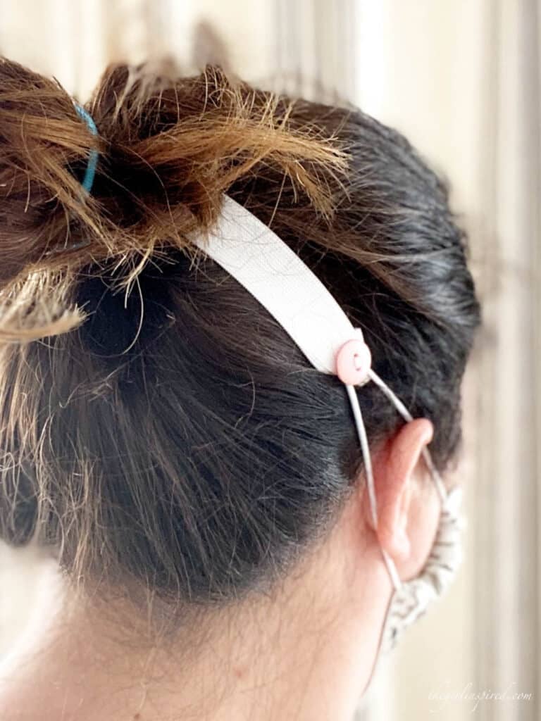 If you’re making it for yourself, play around with the length and where you where it to see where to put it without a ponytail – you might need to make a much shorter one around the back of the neck. It’s also going to depend on the length and stretch of the mask straps. Good luck!