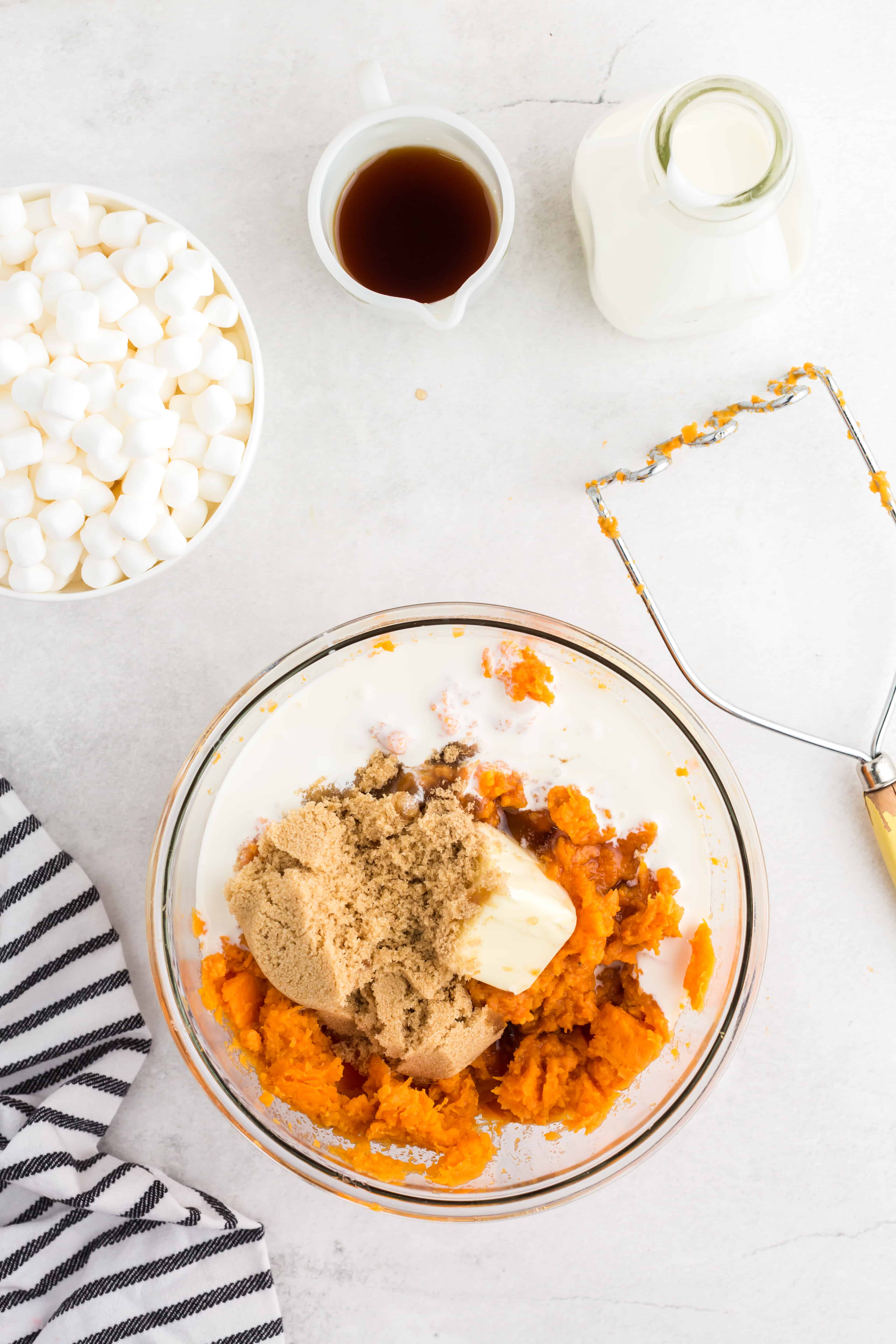 Step 2: Now we’re going to add the “candy” part. Toss in all of the add-ins except for the marshmallows. The butter will melt down as you mix. Mash everything together with a potato masher or a fork. If you like your yams a little bit chunky, that’s just fine! Mash them down to your preferred consistency.