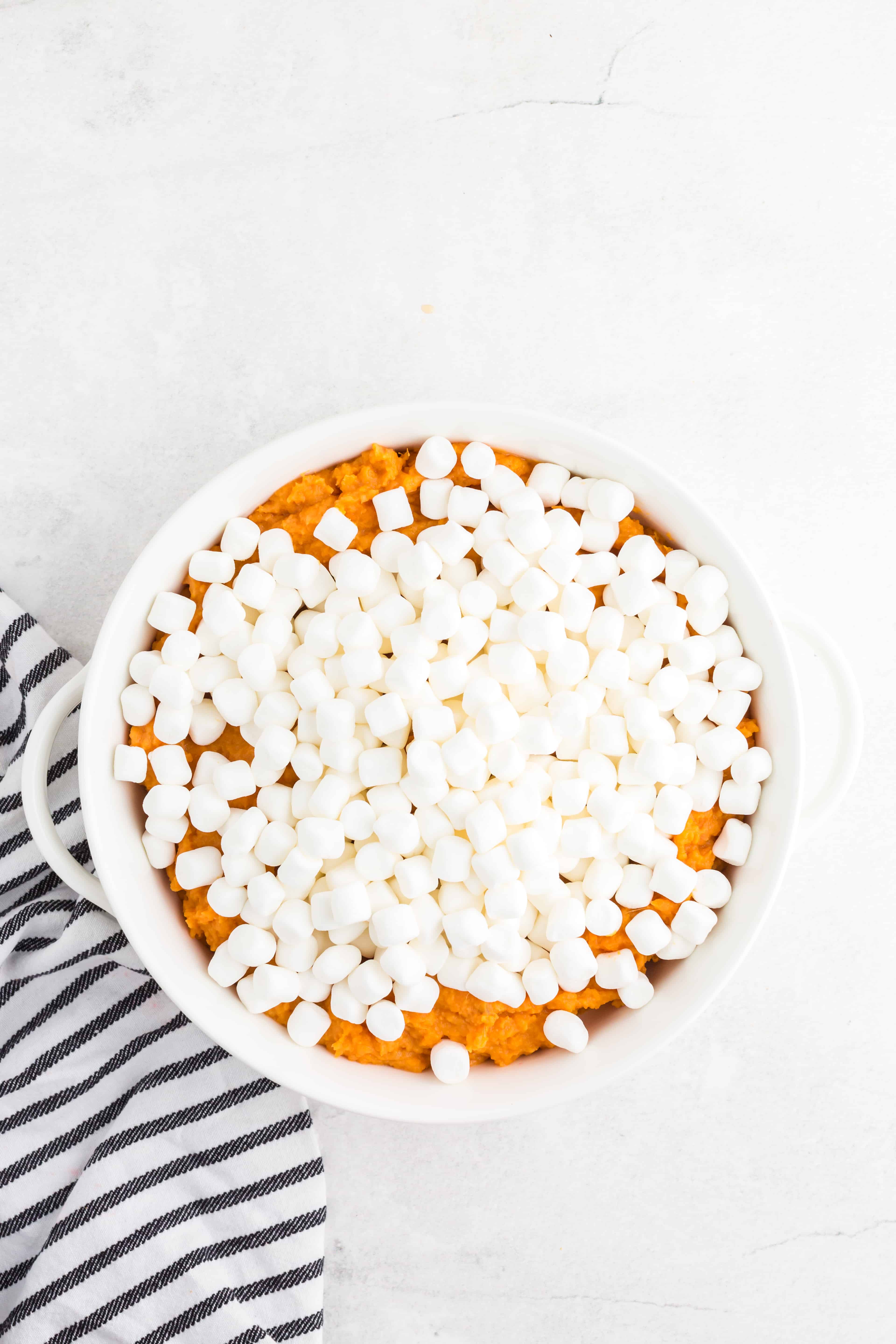 - Sprinkle mini marshmallows evenly over the yams.