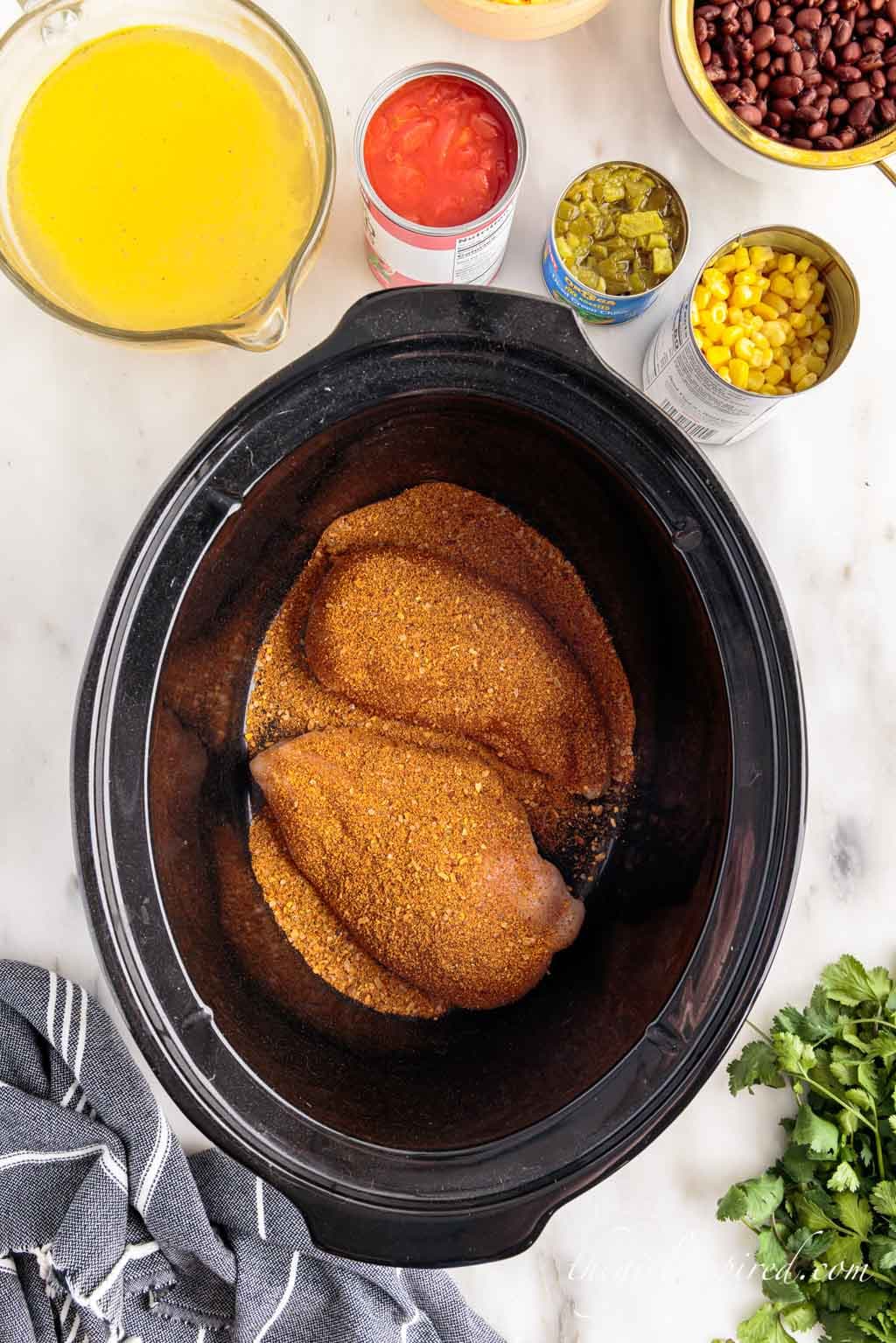 Add the chicken and seasoning. Place the chicken in the bottom of the slow cooker and cover with taco seasoning.