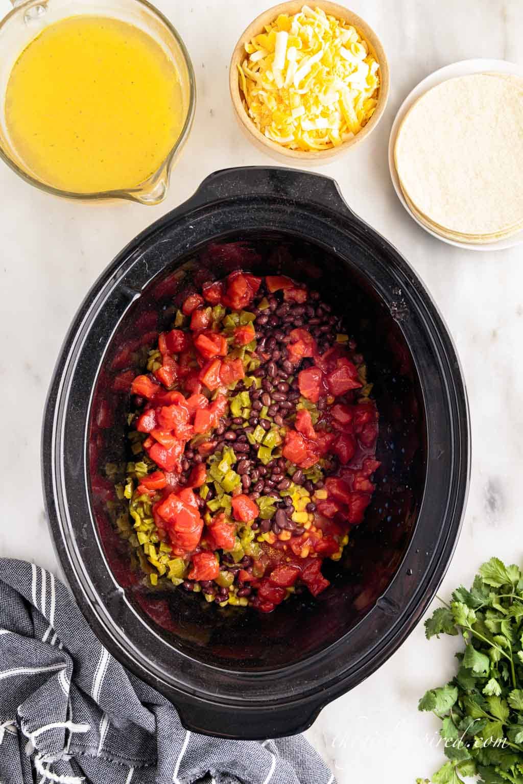 Add remaining ingredients. Cover the chicken with chiles, beans, corn, and tomatoes. Pour in the chicken broth.