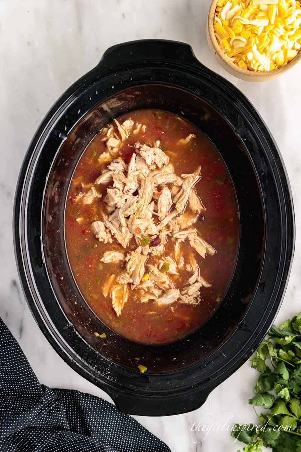 When it comes out of the pot, it is a bit thinner – my family loves to load up their bowls with tortilla chips, even more cheese, avocado, etc., so that thickens up the soup. But if you wanted it thicker straight away, you can reduce the amount of broth – maybe by a cup? Or let it cook on high for 30-min-1 hour with the lid off after the initial cook time to reduce down some of the liquid. You could also add cream cheese or extra grated cheese.
