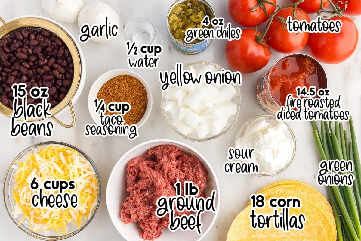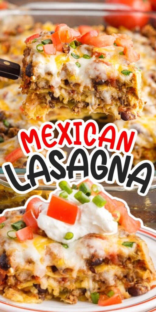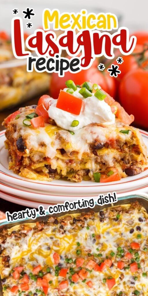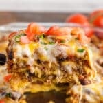 This tasty Mexican Lasagna Recipe has layers of tortillas and is packed with a cheesy meat sauce including black beans and fire-roasted tomatoes! Not only is it a great option for a freezer-friendly meal, but it’s also ready in just 1 hour! Serve with your favorite toppings and sides for the ultimate Mexican casserole!