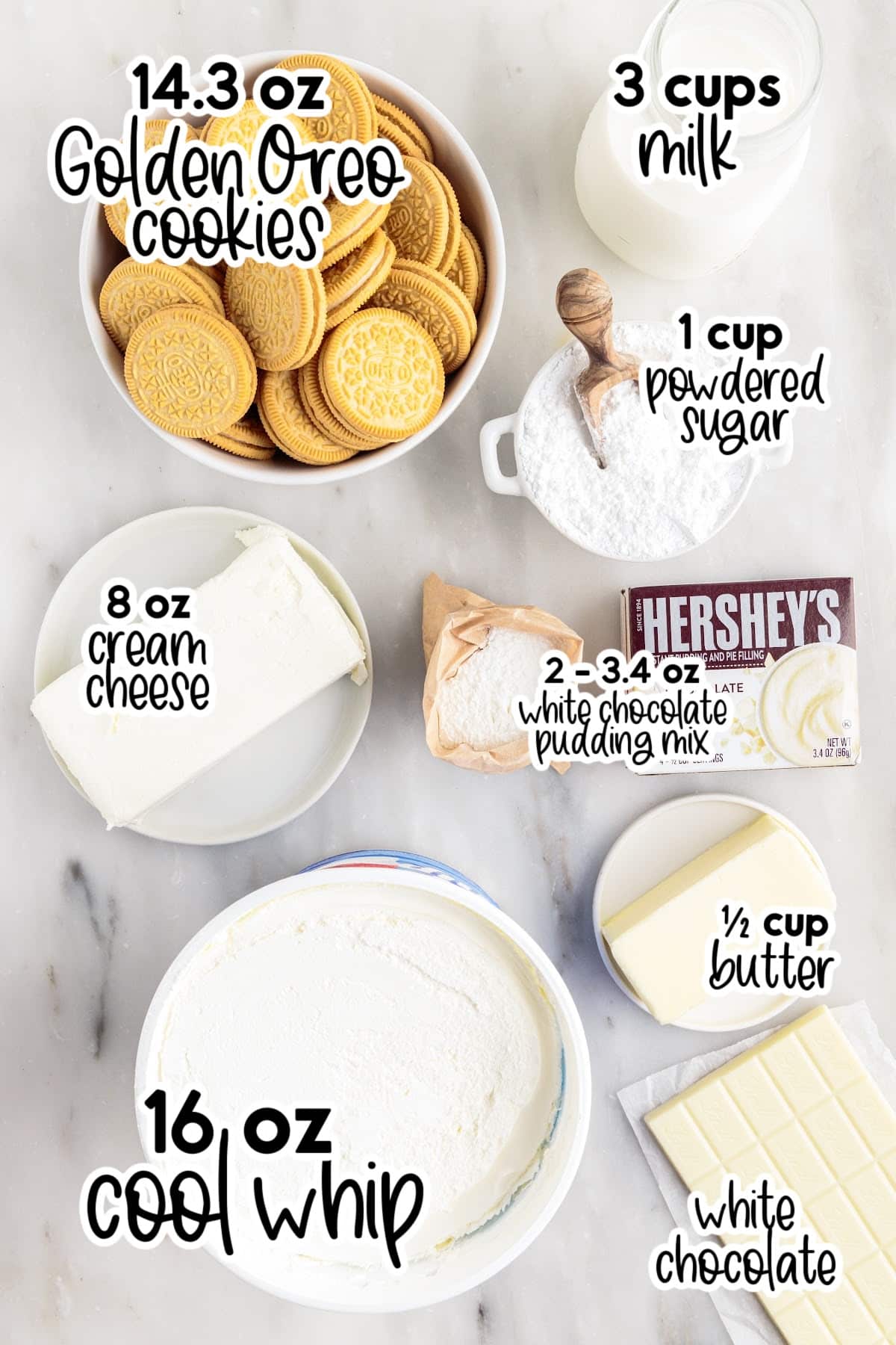 - Instant white chocolate pudding mix – your favorite store bought brand