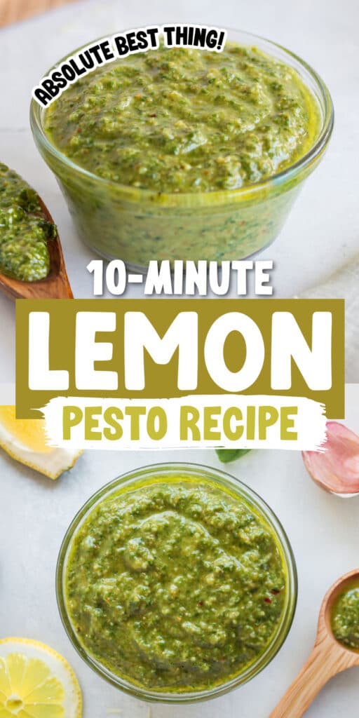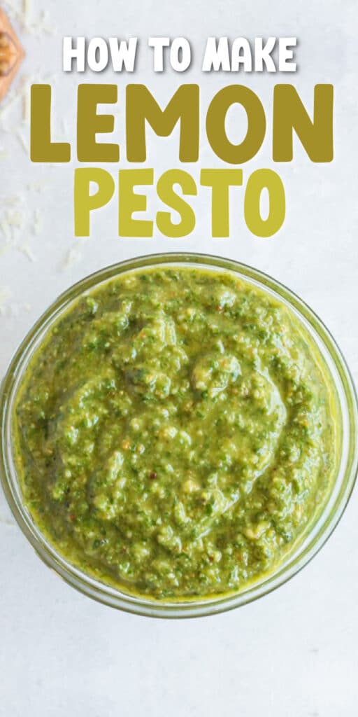 Step 7: Transfer to a serving bowl or store in an airtight container with a thin layer of olive oil over the top and or a little fresh lemon juice. The lemon basil pesto is ready to eat!