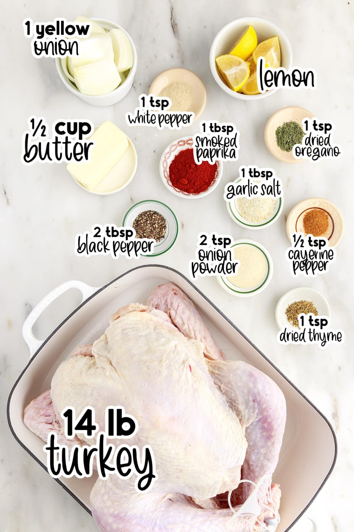 - yellow onion and lemon – dice into large chunks and stuff inside the cavity of the turkey for flavor while cooking