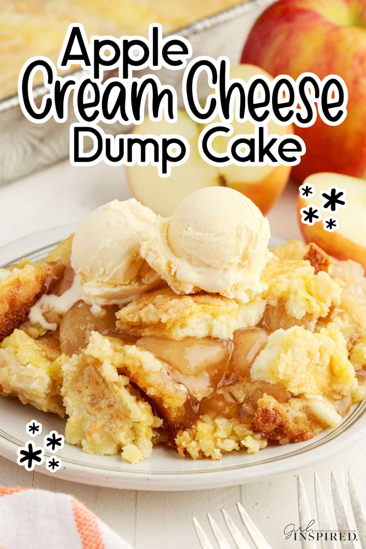 Apple cream cheese dump cake is full of tender apples, warming spices, and is topped with a buttery cake topping. It is one of the easiest desserts to make, taking just 15 minutes to prepare and a quick bake in the oven.