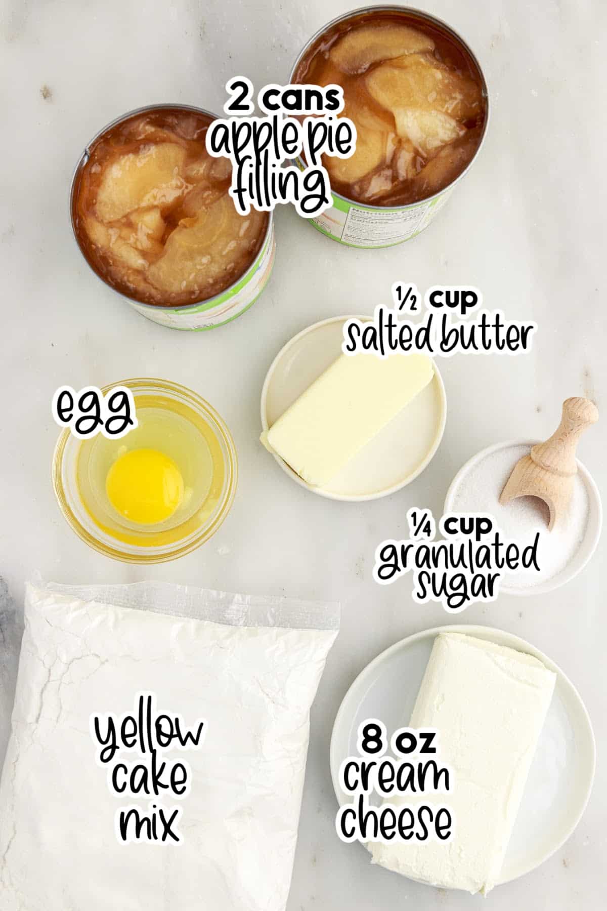- canned apple pie filling – see the substitutions if you would rather make your own filling. Use either the traditional apple pie filling or the caramel apple pie filling.