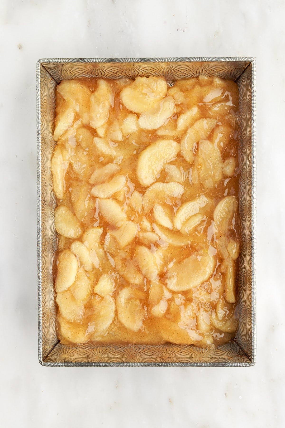 Step 1: Add the apple filling to the bottom of a 9×13 baking dish.